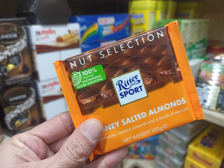 این شکلات ترکیبی از شکلات شیری با مغز بادام بو داده عسلی نمکی است که معمولا طعم را بهصورت ترکیبی از شیرینی و کمی شوری توصیف میکنند